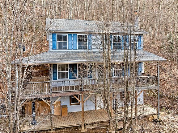 Retreat to a lush wooded hideaway–Located at 842 Grouse Rd in Clyde, North Carolina, this 3-bedroom, 2.5-bathroom home on a 0.91-acre wooded lot. It sits at an elevation over 3,700 feet, providing privacy, a quiet country setting, and mountain views. The exterior includes a large wraparound covered porch and deck for outdoor relaxation, along with a fenced in front yard. Inside, the main level has a spacious a dining room and living room with mountain views, a half bath, and laundry area. The upper level contains all three bedrooms, including walk-in closets, and two full bathrooms. The finished basement is versatile space, such as a den, home gym, craft, or game room.