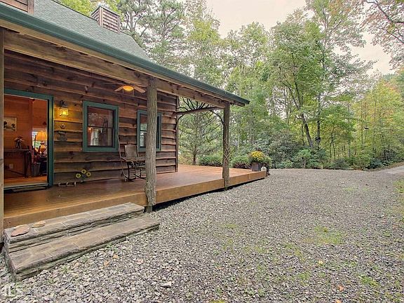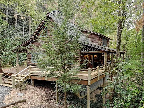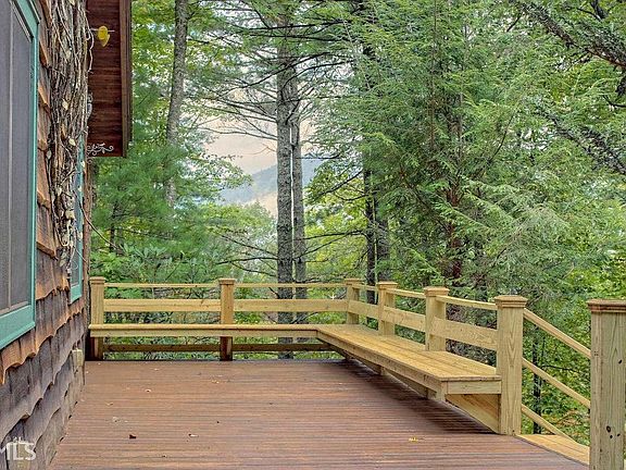 Rough-sawn and shake sided cabin tucked away privately in one of the most beautiful and convenient settings in Rabun County. Surrounded by mountain laurel and rhododendron with a year around glimpse of mountain view, you can hear the sounds from the waterfalls down in the valley below. Gorgeous wood finishes throughout the interior are accented by the stone fireplace and handcrafted laurel handrails. Open kitchen and dining room, vaulted great room with loft above. Master on main, upstairs has another bed, bath, and loft office or space for more guests. Thousands of acres to discover just off the property line joining US Forest Service and Black Rock State Park. This cabin has great energy, and it is so relaxing!