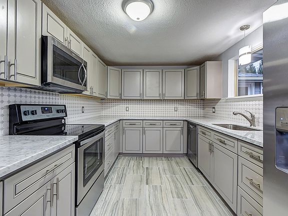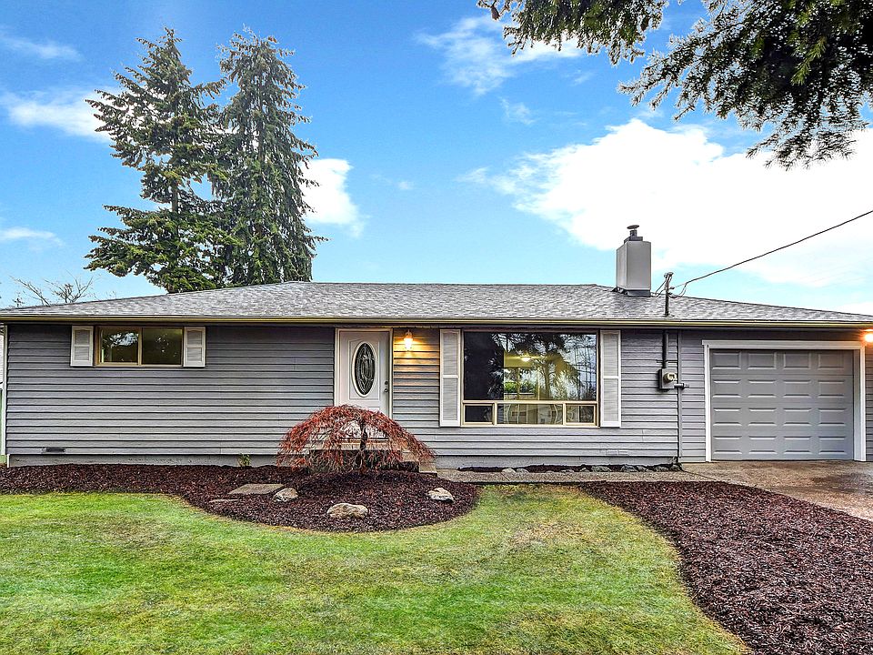 The perfect starter or downsizer 2bd/2ba rambler. Spacious kitchen equipped with tile flooring, gray slow-shut cabinets, full backsplash atop high-end marble counters greeting stainless steel appliances. Elegantly remodeled with custom solid hardwood floors throughout, new paint and trim. Warm yourself by the wood stove after a relaxing evening on the substantial back deck or level yard perfect for landscaping, with 2 10x10 sheds for additional storage, as well as a 6 person hot tub with a metal roof gazebo. Convenient access to freeway, groceries, and all of your daily needs.