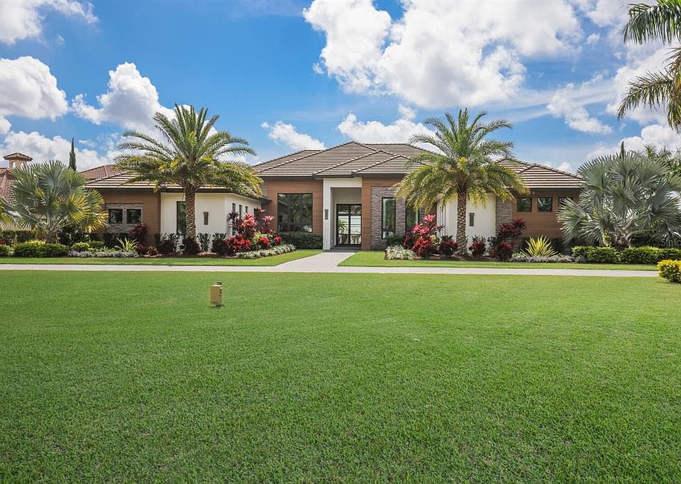 Designed with a nod to the modern movement of architectural styles and positioned on a scenic 1.71 acres in the exclusive and sought-after gated community of The Concession, this residence showcases clean lines, exceptionally planned indoor-outdoor spaces, and the latest in smart home technology. Voted “Best Overall Home” by Parade of Homes in 2021, the former Newcastle model was built by John Cannon encompassing 4,814 square feet of generously proportioned one-story living including private casita, and an expansive outdoor retreat encompassing 2,806 sqft screened lanai with extensive open and under cover spaces grounded with deep gray slate pavers, soaring accent ceilings, full summer kitchen, lounging chaise deck, putting green, fire pit, PebbleTec heated saltwater pool/spa with sun shelf, panoramic clearview screen, and a separate nature viewing deck to enjoy the lake views beyond. 10' accordion-styled impact glass walls with black iron horizontal lines seamlessly connect the resort-styled outdoor living space to a grand great room with sumptuous hardwood flooring, gas fireplace and stunning beam-accentuated ceilings. Dinner guests are treated to an open feel surrounded by disappearing cornerless glass doors and an all-glass temperature-controlled wine room with backlit agate accent wall. Meanwhile chefs will delight in the oversized kitchen with show-stopper sized windows, two separate marble islands, Albrecht wood cabinetry, a hidden pantry with built-in cabinetry, and all high-performance appliances. An impressive club room directly off lanai beckons for entertaining complete with built-in beverage center, luxuriant ceiling design and direct access to an open courtyard. Relax and unwind in the owner’s quarters positioned on a private wing, offering a spectacular ceiling treatment, large scale windows overlooking the lake, direct lanai access, two oversized walk-in customized closets, and a luxuriously appointed bath with two separate vanity station wings anchored by an oversized all-glass dual entry shower at its center, a jetted tub surrounded by walls of glass looking into a private courtyard with outdoor shower, and even two separate water closets. The private casita off the lanai is optimal for guests with its own morning bar, walk-in closet, private full bath, volume beamed ceiling and stunning views. On a separate wing of the home there are two additional guest suites generous in size, both with walk-in closets and connected to private full baths. The residence also offers an impressive office behind double-entry doors with elevated step up area, built-in shelving and accent sconce lighting. Other notable highlights of this 7,704 total square foot residence includes a brilliantly located laundry room with cabinetry, sink, and desk area, Navien tankless water heater, built-in mudroom area, a dual split side load 4-garage, one with an air-conditioned wall unit, and Control4 home automation and networking system unifying lighting, audio, video, climate control, and security. This bespoke offering defines modern refinement beckoning a lifestyle fulfilled in this renowned community infamous as the home to the World Golf Championship PGA golf tournament in February 2021, to the World Champions Cup in December 2023, and to its striking oak hammocks, pines and large lakes, all near dining, shopping, polo, events in the vibrant Lakewood Ranch and UTC area, yet still nearby to the enriching culture and beaches of Sarasota