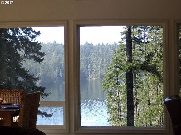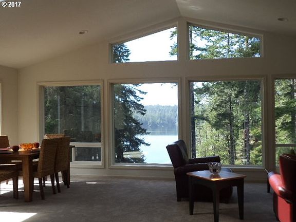 Stunning views! 2700+ sq ft, open living area with high ceilings and rows of windows give you a captivating view. Large deck w/hot tub. Master has vaulted ceilings, slider to deck, jacuzzi, walk-in-closet. Enjoy entertaining? Large downstairs family room w/cabinet/small refrigerator. Deeded Lake access! Downstairs room is without carpet but pad is in. RV parking.