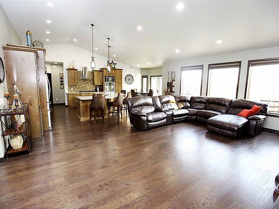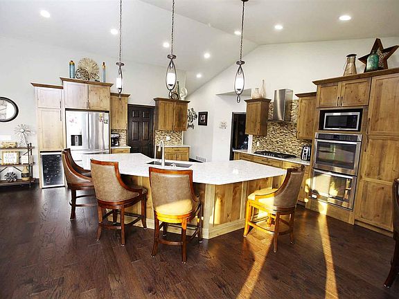 Exclusive home on 5 acres, minutes from Minot, abundant wild life, what more is there? Pulling up to this custom ranch style home you'll be greeted with beautiful curb appeal, mature trees, a flat lot, privacy, and everything to make this location ideal. Walking in the front door the entry way is large with room to kick your shoes off. The living room is open to the kitchen with HUGE windows that burst the home with natural light. The kitchen is all custom stained knotty alder cabinetry, modern Cambria quartz countertops, backsplash, dual ovens, 5 burner gas stove, wine fridge, along with a liquor cabinet. The dining room has quick access to the MASSIVE deck for all your entertaining needs. The master bedroom is jaw dropping with access to the deck which is perfect to enjoy your morning coffee on. The master bedroom features a large walk in closet, and en suite with dual sinks, Cambria quartz countertops, a soak tub, and a custom tile shower with dual heads and a rain shower---WOW! The main level also features two bedrooms with a joining full bathroom. The laundry room is conveniently located off the garage along with a half bath. Heading downstairs the walls measure 9 feet high, the living room is amazing with a pool table area and walks out to the patio area! There are two bedrooms down here along with a ¾ bathroom. The backyard is freshly sodded with lots of room to entertain. The home provides an attached 2 stall heated garage, and a detached 2 stall not heated garage.
