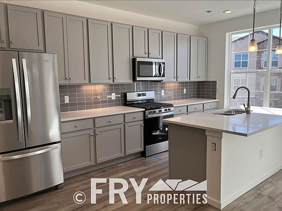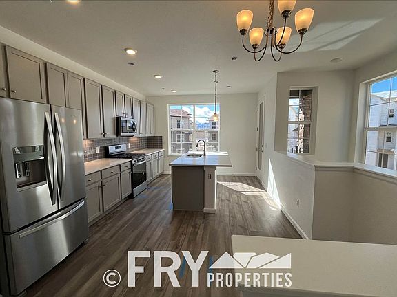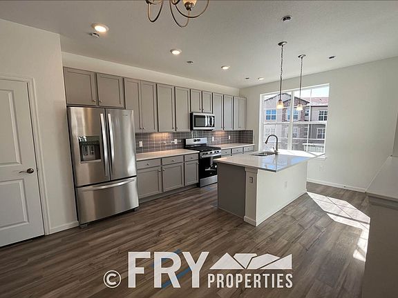 This must-see modern and spacious end-unit townhome boasts beautiful views of McLellen Reservoir and the Rocky Mountains. The ground floor highlights a large bedroom, full bath, and access to the two-car garage. The main floor features a spacious floor plan with abundant natural light, a new kitchen with quartz countertops and stainless steel appliances, a dining area, and a balcony off the kitchen. This floor also has a sizable living room with fireplace and 1/4 bath. The top floor has wonderful views throughout, along with two good-sized bedrooms, a second full bath, and a laundry area. This floor also features the primary en-suite bedroom with walk-in closet.