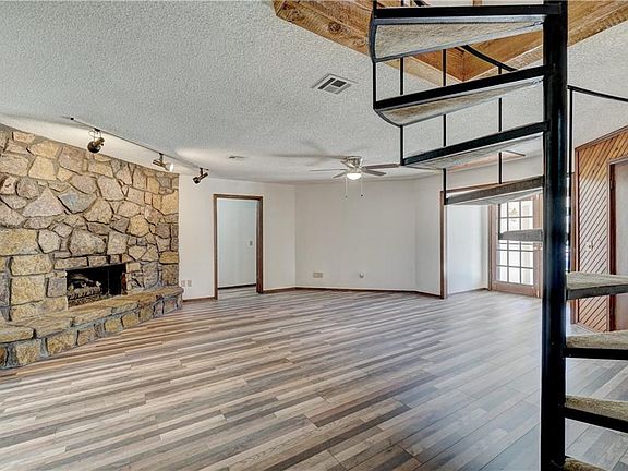 Great family home on secluded street with 3 Bedrooms and a spiral staircase to what could be used as a 4th. Large living area with fireplace in addition two additional flex rooms for entertaining, hobby or study. Light white palette on walls accented with new farmhouse type vinyl flooring with new carpeting in bedrooms. Kitchen features granite counters with stainless steel appliances including new Samsung refrigerator. Wet bar in hallways of living. Master bedroom has second fireplace both with gas logs. Private yard with 10' fence and wood open deck. A Great family home and neighborhood.