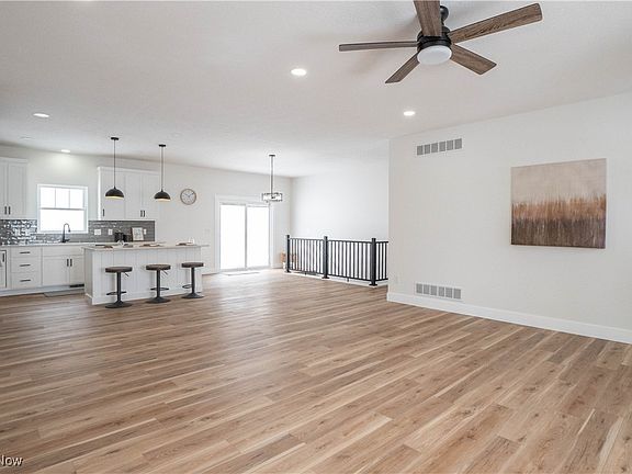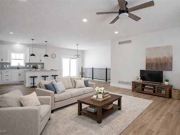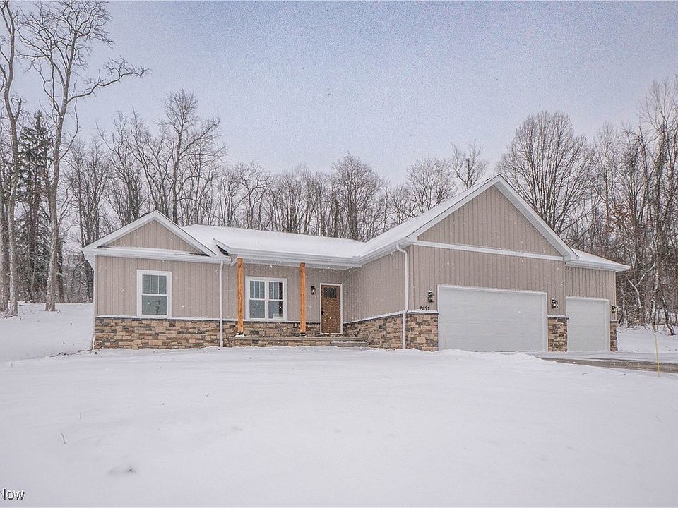 Brand-new 2025 ranch home set on a beautiful 2-acre wooded lot in Wadsworth Township! Be the first to call this thoughtfully designed 3-bedroom, 2-bath home your own. The welcoming exterior features a charming front porch with wood beam pillars and stone accents. Inside, enjoy an open-concept layout connecting the living room, kitchen, and dining area—perfect for everyday living and entertaining. The living room offers accent wall details, flowing seamlessly into the kitchen with a island with a breakfast bar, quartz countertops, tile backsplash, soft-close cabinetry, and sleek black finishes. The eat-in dining area includes sliding doors leading to the peaceful backyard. A convenient laundry/mudroom with built-in bench and storage adds everyday functionality. The primary suite features a barn door to a private bath with quartz countertops, a tiled shower and a large walk-in closet. Two additional main-level bedrooms share a full bath with tub/shower combo. The finished lower-level recreation room provides extra living space, with additional unfinished areas offering room for future expansion. Three-car garage, well and septic. A perfect blend of modern finishes, functionality, and serene outdoor space—don’t miss this one!