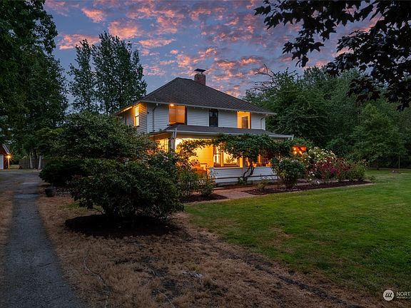 Step into history w/ this remodeled 1910 Four Square American Colonial on a fully fenced 5 acres. The charming home features 3 bdrms that live like 4, & 2 luxurious bths. A grand front porch welcomes you. Original staircase, & spacious rooms w/ 10-foot ceilings. Hardwood floors, wood fireplace, designer wall coverings, remodeled kitchen & fresh paint throughout enhances the charm. Studio space downstairs w/ a full bath. Outbuildings include a 3-car garage & a 2-story finished gambrel top shop, potential for an ADU. Surrounded by privacy, you’ll find a MIL cottage. Start your hobby farm w/ a fenced pasture, hayshed, & lean-to run-in. Close proximity to Birch Bay Beach. This is more than a home; it's a lifestyle to cherish!