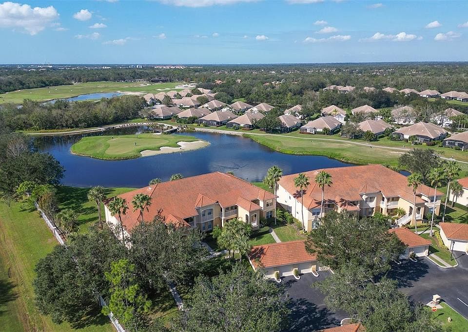 GORGEOUS LAKE & GOLF COURSE VIEWS of Water then Legacy's 8th Green in LAKEWOOD RANCH. Beautifully finished, this light and bright second floor end unit features neutral décor, vaulted and tray ceilings, quartz countertops, updated fixtures and fans and diagonal tile in the main living areas. Situated on hole 8 "Arnie's Island" of Legacy Golf Course, you will love the stunning lake and golf course views from your expansive Great Room, owner's suite and screened covered lanai. Desirable Great Room design incorporates living and dining areas that open to your kitchen and screened lanai with sunshades and Lucite sliders where you can relax, unwind and enjoy beautiful sunsets. Dine-in Kitchen features quartz countertops, marble backsplash, expansive breakfast bar, wood cabinets and Samsung stainless steel appliances including a new dishwasher. The spacious owners suite overlooks serene lake and golf course views and includes dual walk-in closets, ensuite bath with updated shower featuring tile to the ceiling and frameless door, dual bowl vanity with quartz countertops and linen tower. Your roomy 2nd bedroom and bath is ideal for family and guests with pocket doors separating the bedroom and bath and hall closet for privacy. The study with golf course views and pocket doors provides a space for your home office, leisure pursuits or additional guest room. Convenient interior laundry room includes front load LG washer and dryer, cabinets and shelves for storage. A separate single car garage with shelves, pull down attic stairs, light and flooring for ample storage complete this wonderful condo. Amenities include Resident Clubhouse with gathering room and kitchen and heated pool and spa. Lakewood Ranch Country Club offers optional memberships where you can play tennis, pickleball, workout, golf, socialize or simply relax, there is something for everyone! Live in Lakewood Ranch, the #1 Multi-Generational planned community in the USA, just minutes to dining, shopping and movie theater at Lakewood Ranch Main Street, UTC Shopping Mall, Nathan Benderson Rowing Park, I-75 to travel north and south and close proximity to SRQ Airport. It's a quick drive to downtown Sarasota's cultural venues including diverse cuisine, art galleries, theater, performing arts, symphony and ballet and our Gorgeous Gulf Coast Beaches. Room Feature: Linen Closet In Bath (Primary Bedroom).