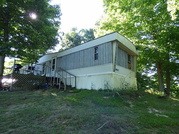 COUNTRY LIVING CLOSE TO TOWN. Get away to 5-wooded acres, singlewide mobile home with tip-out which extends the living room and dining room space. Large 2-car detached post building garage with electricity and concrete floor built in 2009. Ramp leads up to deck on front, 3 bedrooms, 2 baths, back deck with all appliances staying. Enjoy the wildlife and woods with drivable trail to the back of the property. Large field area is the perfect spot to build your new home or plant a huge garden. Only $34,900!