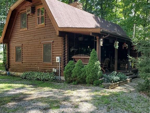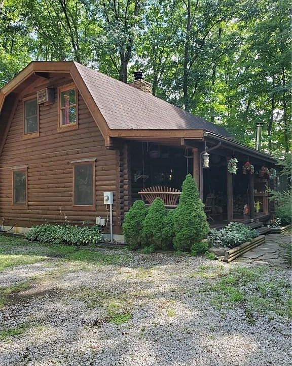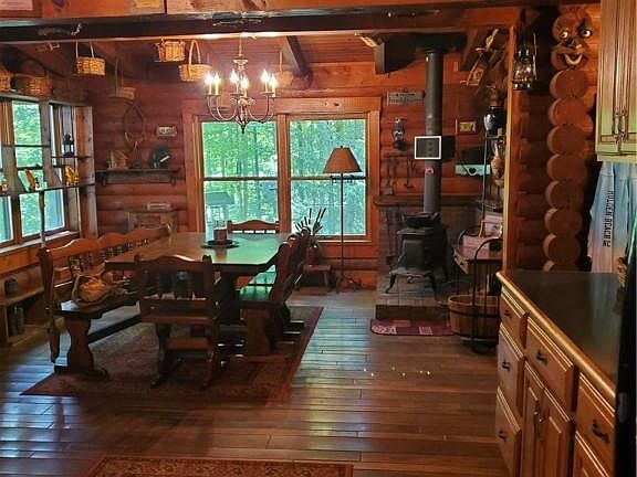 Log cabin home built in 1996 on 3.6 wooded acres and peaceful settings. 3 bedrooms and 2 1/2 baths, a large 2 car detached garage. Beautiful woodwork throughout the home. The 1st floor consist of a laundry room, 1/2 bath, a large eat in kitchen and large living room, both with wood burners. The 2nd floor has all 3 bedrooms and 2 full baths with the master bedroom having its own master bathroom. A nice porch and a deck in the back to relax too. All appliances stay. Home warranty included!