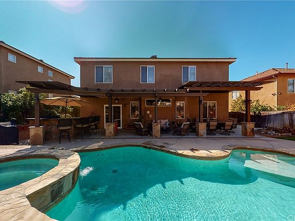 Beautiful, Spacious home in Orangecrest with a Gorgeous Master Retreat. Open Concept kitchen/dining/family room. White Kitchen cabinets upgraded with soft close doors and drawers. Subway tile backsplash, island with bar seating, and stainless appliances. Nest Wifi thermostats, downstairs leaded glass accent windows. There is a loft upstairs. Master Retreat. Oversized Master bath has dual counters and sinks. Separate shower and Bathtub. Large walk-in Closet. Dual A/C units and fans throughout. Natural gas BBQ island with bar and refrigerator; insulated alumawood patio cover with fans and lighting. Goldfish pond, shed, and dog run. Pool/spa with baja shelf, led colored lighting and umbrella holder. Drought tolerant landscaping with extra-wide driveway to park 4 vehicles. Within walking distance to Orange Terrace Park with Fields, Community Center, Library, Playgrounds, Courts, etc. Close to the best schools in Orangecrest. Community has top-rated schools with no HOA and low taxes.