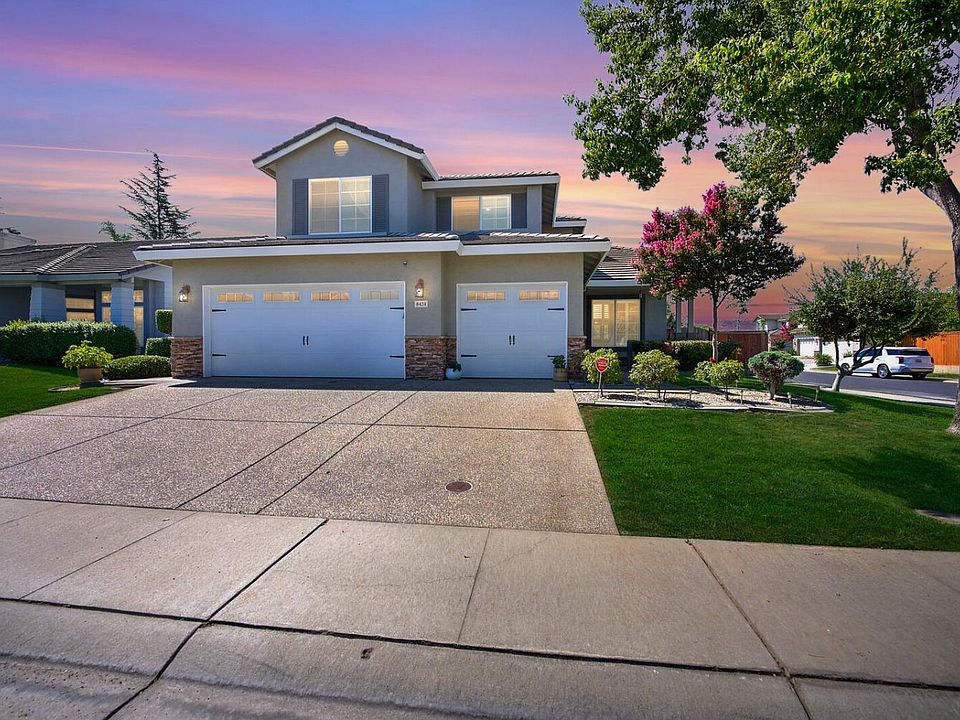Welcome to 8424 Kingmont Way. Nestled in the quiet Sheldon Pacific subdivision of Elk Grove, this two-story, FIVE bedroom, THREE full bath home is sure to impress. The fantastic curb appeal offers mature landscape & spacious porch- an inviting prelude to the well appointed interior. Step inside to vaulted ceilings & open floor plan with formal living & dining room. Separate family room at back of home opens to spacious kitchen, ideal for home chef & large gatherings. Updated Quartz countertops, full tile backsplash, island w/ pendant lighting over seated bar, recessed lights, plenty of cabinet & counter space for food storage & prep. In kitchen breakfast nook for everyday dining. ONE bedroom & updated FULL bath downstairs provides flexibility for a guest or in-law room. NEWER vinyl flooring & upgraded plantation shutters throughout lower level create seamless continuity. Located upstairs are FOUR additional bedrooms including the spacious primary bedroom. En suite bathroom features separate shower stall w/ tile surround, large soaking tub, dual vanity & TWO walk-in closets. Spacious bedrooms & updated hall bath w/ shower surround & glass enclosure. Enjoy Summers in the Backyard- expansive concrete patio w/ cover, ceiling fan, planter boxes & possible RV access and so much MORE!