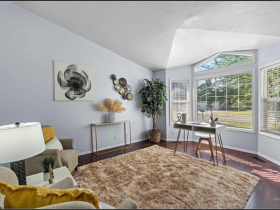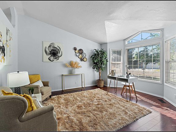 Rare home over 1500sf in Boise under $420K. Vaulted ceilings on main level and open floor plan gives comfortable spacious feel. Two livings areas. Updated modern designer color kitchen with blue & white cabinets, granite counters, new stainless steel appliances, tile floor, eating bar & pantry. Large sunken living room with gas fireplace. Master and both guest bedrooms upstairs. Comfortable master suite with walk-in closet. Good sized garage with extra 10'x7' storage/shop area. RV Parking! Extra driveway parking too. 22'x10' covered concrete patio in large quiet backyard. Shed. No HOA or dues! Low property taxes. Seller will even help buy your interest rate down! Ask agent for details.