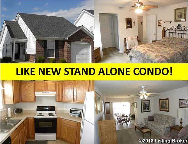 If you are looking for an incredible deal, this is it! Seller paid $112,207 in 2005, and has done upgrades since purchase. This is not a short sale or a foreclosure but is priced like one. Seriously Like New Stand Alone Condo that has been meticulously maintained by current owner. It has barely been lived in. Look at all pictures and take the virtual tour. Amenities include: * Stand Alone Condo w/attached one car garage * Entrance w/glass storm door * Foyer * Spacious Living Room * Separate Dining Area w/sliding glass door to oversized patio * Fully equipped kitchen w/abundant cabinetry and prep area * All kitchen appliances will remain (note the stove/range has never been used) * Spacious laundry room w/attached storage cabinets (BONUS, THE WASHER/DRYER WILL REMAIN) * King-Sized Master Bedroom w/custom shelving in master walk-in closet * Guest bedroom * Full Bath w/make-up station and has a private access from the Master Bedroom as well as a guest access * Seller made upgrades while under construction and they include: oversized patio, upgraded carpet, dedicated pantry in kitchen, custom shelving in master bedroom, upgraded fixtures, upgraded full glass storm door and NEW as of May 2012 is a 2.5 ton AC unit (previously had a 2 ton unit) * Arbor Creek is conveniently located to I-265, I-65, and major dining and shopping complexes. The monthly maintenance fee of $110 includes: Trash Removal, Exterior Maintenance, Snow Removal, Master Insurance, Grounds Keeping, and Pest Control. This beautiful Stand Alone Condo is a true pleasure to show and will not disappoint. Easy to show!