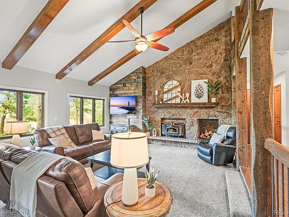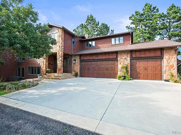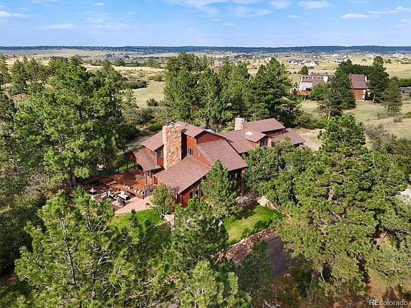 Discover this stunning 5-bedroom, 4-bath custom home, nestled on 5 tranquil acres of majestic pines. A brand-new roof adds peace of mind to this already exceptional property. With breathtaking views, abundant wildlife, and thoughtful upgrades, this home offers a lifestyle of comfort and luxury. Step outside to the impressive 1,800 sq ft outdoor living space, perfect for year-round enjoyment. Cozy up by the large stone fireplace, grill on the dedicated gas line, or gather around the gas fire pit or the many covered dining and seating areas (there's even space for a hot tub). Green thumbs will adore the covered garden, while the charming chicken coop, dog run, and room for horses make it an animal lover’s paradise. Inside, a grand rock fireplace anchors the inviting living room, while the remodeled chef’s kitchen shines with Viking appliances, three ovens, a walk-in pantry, and a sunny breakfast nook. The parlor is a showstopper, complete with a vintage bar, beverage fridge, dishwasher, fireplace, and a bathroom with a sauna. The primary suite is a retreat in itself, featuring a cozy fireplace and a spa-like en suite. Upstairs, you'll find two additional bedrooms, a 5-piece bathroom, a laundry room, and a secluded home office. The finished walk-out basement offers a family room with a fireplace, wine storage, and two additional rooms for your needs. Storage and workspace abound in the attached 3-car garage, complete with custom cabinetry. The property also includes a prime spot for a future outbuilding, offering endless potential. Conveniently located near Downtown Castle Rock and Parker, this home strikes the perfect balance between peaceful seclusion and easy access to modern conveniences. Previously under contract, it successfully passed all inspection deadlines, but the buyers had to terminate due to their own property sale. This exceptional property is ready for its next chapter—could it be yours?
