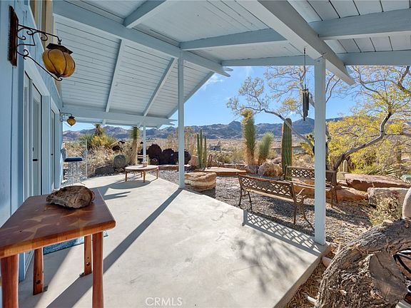 This is a real charmer. Over 1400 sq. ft., two bedrooms, and 1.50 baths sitting on four-plus acres in the prestigious area of Monument Manor in Joshua Tree, CA. Initially, the property was two separate parcels, but the owner combined to save on taxes. This means to the investor they can be separated back into two parcels built on one property and then sell the main home!!! Or not!! The main home has a beautiful fireplace in the living room. The ceilings in the original part of the home are gorgeous vaulted beams and wood ceilings. The kitchen has been gutted. The owner is a craftsman with a lot of projects. There is a greenhouse and many small storage sheds on the property. The views and the landscaping are spectacular!!! Some ancient cactus and rock formations. The front patio is just one of the nicest I have seen for views of the National Park. You must walk up the road to the second parcel with a few small buildings. The route appears to end here for maximum privacy. This property is an excellent find for the investor!!!