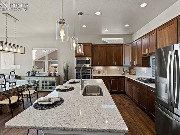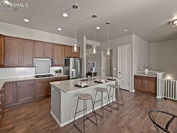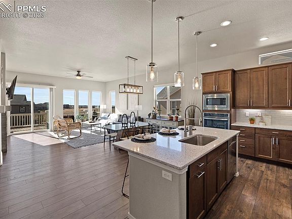 Built by an award-winning builder in an award-winning community; this Classic Home in Banning Lewis Ranch is a true gem. The impressive main level & sprawling finished basement is the epitome of luxury living with a community feel. As you step inside, you'll be greeted by a warm & inviting atmosphere, with natural light streaming in from the floor-to-ceiling windows. The open-concept living room has high ceilings & beautiful floors, making it the perfect space for entertaining. The kitchen is a chef's dream, with stainless-steel appliances, granite countertops, and a large island. The main level also features a spacious Primary Suite with a barn-door that leads to the attached bathroom, complete with an over-sized walk-in shower, dual vanity sinks with Quartz counters, and walk-in closet. There is another bedroom and full bath on the main level as well. But that's not all. This home also boasts a finished basement that is truly a showstopper. With a large entertainment area and two specious bedrooms with another full bathroom, the possibilities are endless. The 5th bedroom is currently used as an office. And let's not forget about the outdoor space. This home sits on a generous lot, providing ample space for outdoor activities. The backyard features a composite deck that leads to the Pergola area with professional landscaping that is practically maintenance-free with the newly installed turf. The attached 3 car garage is heated, and has a custom laundry area as you enter the home. Overall, this home in Banning Lewis Ranch is a true masterpiece, offering the perfect combination of indoor and outdoor living. Banning Lewis Ranch offers many amenities including 2 pools, farmers markets, concerts, dog parks, and over 75 acres of parks & trails.