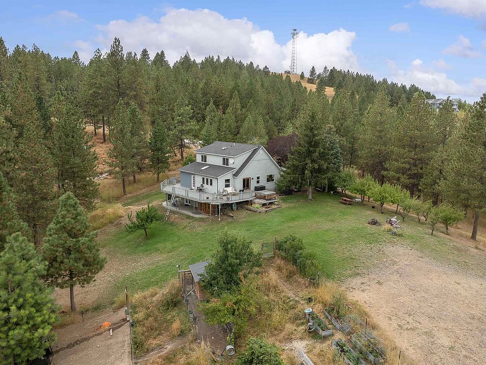 Enjoy morning coffee and watch the sunrise on an elevated deck overlooking 10+ acres of your own serene forested landscape! Breathtaking mountain and city light views. Wildlife mecca - deer, elk & moose. 4 bedrooms, 3 bathrooms, plus 2 bonus rooms. Featuring an open floor plan with natural light and views from every window. Includes an ADU that would be the perfect guest suite, mother-in-law unit, or rental space. Multiple fruit trees, chicken coop, and your own private RV spot! Just 20 min to downtown Spokane, 17 min to airport, and 8 min to Cheney.