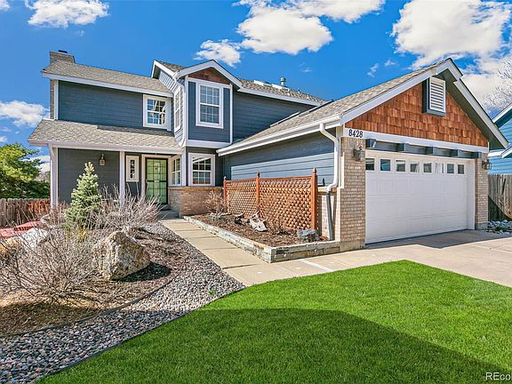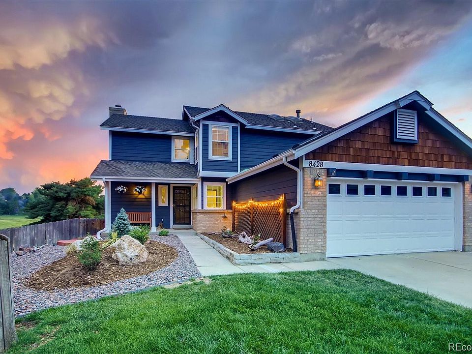 Welcome to this sun-filled haven nestled in Arvada's coveted Lakecrest community, just moments away from Standley Lake. The bucolic view of grazing horses can be seen from the front door through the many windows that span the living room, dining room and kitchen. This spacious single-family home offers 4 bedrooms, 4 bathrooms, and a generous 3,142 square feet of interior space, all situated on a peaceful cul-de-sac backing to the serene horse meadow. Step inside to discover a main floor that exudes warmth and brightness, thanks to its large windows and vaulted ceilings all accented with gleaming hardwood floors. The updated kitchen is a chef's delight with stainless-steel appliances and an expansive peninsula with a gas range. The expansive dining area delivers an incredible wall of windows and doors that invites stunning views while flooding the space with southern sunlight. The dining room and family room open onto the expansive partially covered rear deck. Here, you can savor meadow views, and idyllic sunsets, and watch the horses graze as you grill and chill. Unwind by the stunning two-story gas fireplace in the family room or retreat to the second floor, where three bedrooms await. The primary suite is a sanctuary with vaulted ceilings, skylights, and a 3/4 ensuite bathroom. Two additional bedrooms and a full hall bath complete the upstairs living quarters. The basement offers versatility with an additional bedroom, family room, 3/4 bath, and wet bar, ideal for guests or entertaining. Additional features include a 2-car attached garage, an expansive driveway for off-street parking, and proximity to Standley Lake and its scenic paths. Residents of the Lakecrest community enjoy low HOA fees and stellar amenities, including a community pool, park, playground, mixed-use courts, and trail access. Experience the best of Arvada living in this remarkable home!