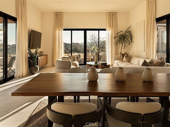 This dream desert compound is an architectural marvel. Realized by Wyota Workshop, every detail has been immaculately designed to complement the captivating landscape. Situated in the serene Joshua Tree Highlands, this 2.5-acre property includes two freestanding homes. They contain 2.5 bedrooms/3.5 bathrooms and 2 bedrooms/3 bathrooms, respectively. Both residences offer private outdoor baths, perfectly positioned for stargazing. The first home features 10-foot ceilings and a primary suite that opens up directly to the outdoor bathing space. Interior details incorporate oak cabinetry, aluminum windows, and custom drapes throughout. The outdoor space features an idyllic pool with baja shelves and an inground spa. Additional facilities include a full pickleball court with sweeping views of the San Jacinto Mountains. For added privacy, there are two private custom entry gates. This light, bright property oozes organic tranquility amid a spectacular location. Contemporary opulence meets organic minimalism in this indoor-outdoor haven. This masterfully-designed gem won’t last!