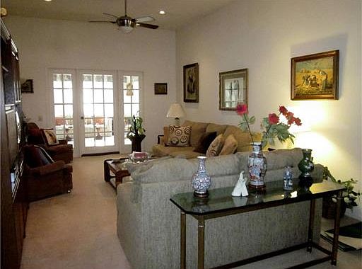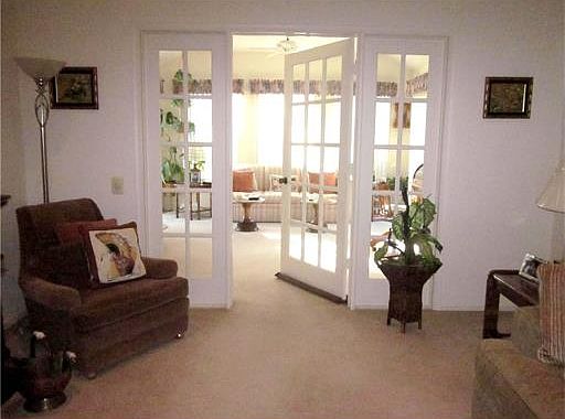 White ceramic foyer and EIK with newer microwave and refrigerator. Vaulted ceiling living & dining room with French doors leading to wonderful sunroom with doors and windows on 3 sides. MBR and guest room are on opposite sides of the home, providing privacy for guests or making an ideal home office. Immaculate condition Move in condition with quick closing possible. Garage has a wall of storage closets plus pull-down stairs to attic. Tree shaded spacious and quiet yard. Recessed lighting in foyer, living room and sunroom. Walk-in closet in MBR. Master bath has oversized soaking tub which was an upgrade as well as linen closet.
