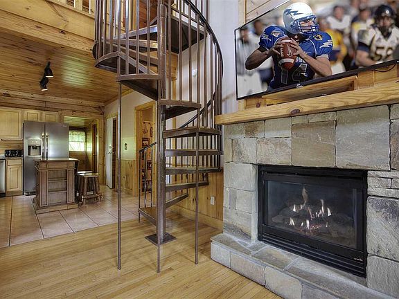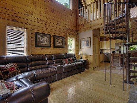 This cabin is half of a duplex. On the the upper level the cabin offers a fully equipped kitchen, living area and a master bedroom and bathroom, as well as dinning room and hot tub. The lower level offers a kitchenette, bedroom, indoor Jacuzzi tub,gas fireplace, built in twin over twin bunk bed, multi game arcade, and deck with a gas grill and outdoor sitting area. Loft area offer queen over queen bunk bed, pool table, multi game arcade,and private balcony with view on Dollywood, so in summer you can enjoy Dollywood's fireworks right from your balcony. Can also be locked off and used as a one bedroom downstairs and 2 bedroom upstairs.