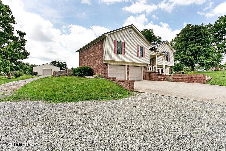 Scenic countryside and beautiful rural living await you at 843 Hobbs Lane. This spacious bi-level home, situated on 8.17 acres, has been meticulously maintained and thoughtfully appointed throughout. Upon entry from the covered front porch, you'll be greeted by a split-foyer design that leads to a large living room and a spacious kitchen/dining combination. The kitchen features custom cabinetry, solid-surface countertops, a full line of stainless steel appliances, and a convenient laundry closet. From the kitchen, step into a fully enclosed and covered back porch—perfect for enjoying the peaceful views of the surrounding countryside year-round. The main living level includes the primary en suite with a private bath. Along with the primary suite, the upper level features two additional bedrooms and a second full bath.