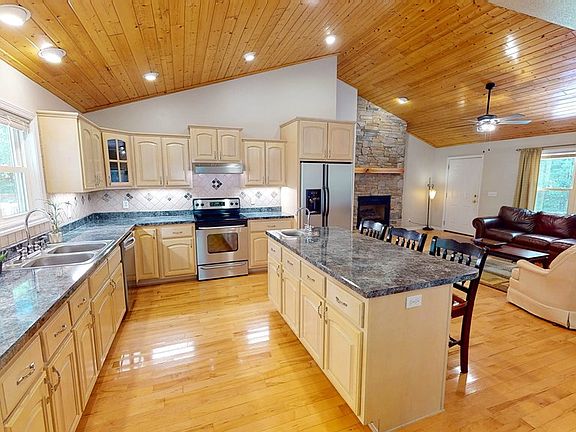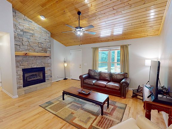 Incredible single level home in great location with GARAGE is hard to find! Step inside this 2 bed, 2 bath home to find TnG tall vaulted ceilings and beautiful eat in kitchen with SS appliances. Bonus Room / Office could be converted into another sleeping area if desired. Large stone gas log fireplace in the living room to enjoy. Laundry room just off the garage entrance. Master bedroom has walk in closet, access to back porch and extra workout area. Master bath has double vanity, large jacuzzi tub with natural lighting & walk in tile shower! The 2nd bedroom comes with its own jungle gym/sleeping loft. Paved access to this home with large concrete driveway. Large storage shed is included. 2 covered porches perfect for enjoy the mountain air. Hard to find this quality home so call now!