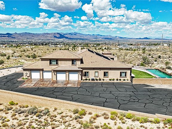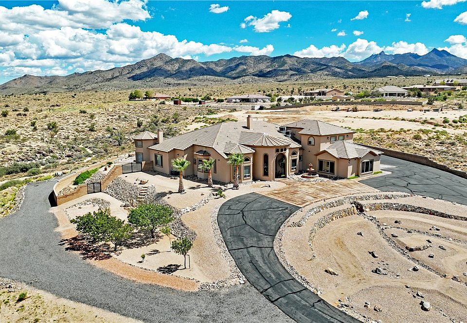 Beautiful Custom Home ~ 5,049 sf ~ 5 bedrooms ~ 4.5 Baths ~ In Ground Pool ~ 5.84 Acres ~ Panoramic Views ~ The sunken living room is a showstopper with its open archways and huge wall of frameless windows. Home has a big kitchen with cherry cabinets, under cabinet lighting, granite counter tops, built in desk & table, island with sink and skylight above. Stainless double ovens, microwave, dishwasher, trash compactor, refrigerator and deep single bowl sink and walk in pantry. Formal dining room has a big bay window, chair rail and chandelier. The large main bedroom is on the Northwest side of the home with an extra sitting room, door out to a private back patio, double walk in closets, double sinks, deep jetted tub and walk in shower with four separate heads. Bedroom 2 is next to it with a big bay window and a full bathroom right outside the door. Cozy family room with big windows and pellet stove sits at the kid s wing. Bedrooms 3 & 4 share a passthrough bathroom, with double sinks and a separate tub shower combo. Bedroom 5 has a big bay window and uses the hall bathroom with a walk in tiled shower. Upstairs is a huge bonus room with built in desk & cabinets, plus a half bath. Floor coverings are porcelain tile & carpet, there are Knotty Alder solid wood doors, windowsills & trim, crown molding, window blinds and ceiling fans throughout. Central vac, whole house filter and soft water system. Home is plumbed for gas, sellers use propane at the outside grill and firepit only. Laundry room has upper & lower cabinets, sink, lots of counter space, front loading washer and electric dryer. Oversized four car garage, about 1,300 sf, over 26ft deep, auto openers, built in work bench, cabinets and overhead storage. Pool has Pebbletec finish, two waterfalls, solar heat and a hard cover. Big rear covered patio has ceiling fans, built in grill, double cook top, sink and lots of prep space. Block wall, stamped & stained concrete, fire pit, outside shower, real grass, fruit trees and garden area. No HOA ~ No CC&R s ~ Horses & Livestock OK ~ Well, No water bill ~ Septic, No sewer bill ~ Owned Solar, with the thermostat set at 80, monthly electric bill is only the UNS fee of $25.00 ~ Private Road ~ 843 S. Desert Canyon Way, Kingman, AZ.