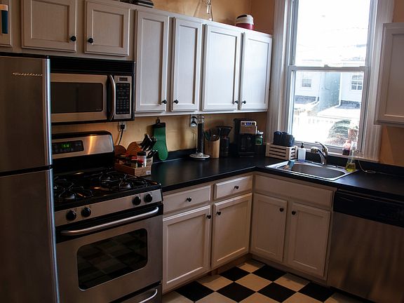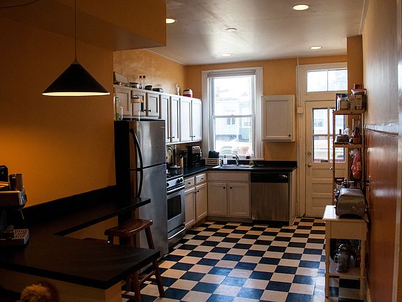 Now on the market is a 3 bedroom 1 bathroom rowhome one block from The Avenue in Hampden. Wellington Street is a quiet, tree-lined street with all the amenities that Hampden has to offer. Here are some of the details: 1. Three bedrooms (one larger and two medium sized) with bright windows and built-in closets 2. 2nd floor bathroom with glass shower 3. Dark pine hardwood floors throughout the house 4. Four window air conditioners 5. Forced hot air furnace (runs great) 6. Front room with bay window 7. Middle living/dining room 8. Full size kitchen with trendy checkered floor and stainless steel appliances (including gas stove and dishwasher) 9. Recently re-stained back porch off the kitchen 10. Backyard features a patio space under the deck, mature landscaping, and a raised garden with fertile soil 11. Full, unfinished basement with auxiliary toilet and plenty of storage space 12. Washer & dryer 13. Fairly good on-street parking (better than other neighborhoods!) Rent is $1,775 per month with an initial 8 month lease. Security deposit and two month rent is required upon signing. Earliest available: November 1st, 2014 Lease term: 11/01/2014 -- 07/01/2015 Conversations with landlord about renewing lease would occur in June 2015. First and last months rent required at signing.