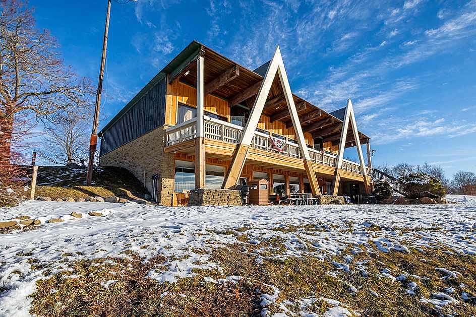Private, sports park, lakefront Lodge. Lodge on 60+ acres. The ultimate Irish Hills getaway! Has it all! Water frontage! Privacy! Acreage! Magnificent panoramic setting with over 7000 square feet living/entertaining space. Plus your own private 9-hole golf course! Plus 2000 sqft pole barn with concrete floor!