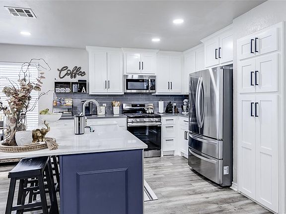 BACK ON THE MARKET through no fault of the seller. This home is fully remodeled! New floors, new island w/ farmhouse deep sink, and newly converted gas stove! As you walk into the front door, you will be captivated by the floor to ceiling fireplace, the tall ceilings and the abundance of natural light. The updates start with fresh paint, new wood style flooring in the living areas, new carpet in the bedrooms and modern LED light fixtures throughout the home, and a beautifully designed master bath with stunning tile and freestanding modern bathtub! The unique layout of this home offers two separate living areas, a dining area, plus a flexible bonus space that will make the ideal home office. The stunning kitchen offers custom built cabinets with soft close doors, custom built island, oversized sink with extended workspace, quartz countertops, and stainless steel Frigidaire appliances. A secluded primary suite offers a luxurious soaker tub, walk-in shower, double vanities and two walk-in closets. The upgrades don’t end inside! This home also has two new water heaters, a new AC condenser, new garage door and motor, new gutters, and an in-ground storm shelter! Schedule your showing today!