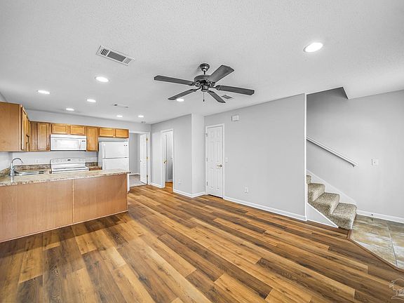 Primary bedroom downstairs. Turn-key contemporary home! This end unit has fresh paint and new flooring. With nearly 1,300 square feet including three bedrooms and two full bathrooms, it's a perfect option for a first-time buyer, rental investor, or any one looking for low maintenance living. The main level features an open living/dining room and kitchen. There's a spacious bedroom and full bath on the first floor, as well as ample storage. Upstairs are the two guest bedrooms and the laundry closet. Each bedroom has two closets and the upstairs guest rooms share a Jack and Jill bath with a double vanity. There is a new roof as well, so all you have to do is move-in! Association covers: building insurance, water, trash, building exterior maintenance, lawn care!
