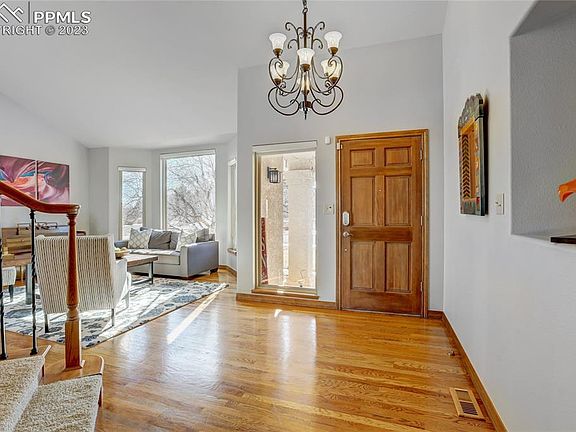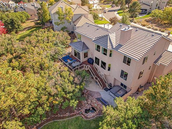 Welcome to this beautiful two-story home, located on a quiet cul-de-sac in the highly desirable upper Peregrine neighborhood. It has fabulous curb appeal and is in great condition. When you enter the home you will be wowed by the gleaming REAL hardwood floors throughout the main level, vaulted ceilings, with walls of windows for plenty of natural light. The formal living and dining rooms are spacious and perfect for entertaining. The large kitchen has a center island with a gas cooktop, granite counters, double ovens, a walk-in pantry, and a casual dining space for everyday meals. You can walk out to the large private deck with stunning views - making it perfect for summer barbecues. The kitchen is open to the cozy family room which has a gas fireplace and wet bar. Also on the main level is an office/den that could also be used as a main-level bedroom, as it has a closet. Additionally, there is a powder room and a sizeable mudroom with the laundry, a sink, and lots of storage off of the oversized 3-car garage (with epoxy flooring). Up the grand, circular staircase is an extended primary suite with a fireplace with an en-suite 5-piece bathroom, and a substantial walk-in closet. Even with all of that, the best feature of the master bedroom is the VIEW! It overlooks the mountains, the 29 square miles of USAFA, and the city lights at night. It is truly breathtaking! The lower level has 2 large bedrooms, a 3/4 bathroom, a wine room with shelving and a small sink, and a large rec room that walks out to a lovely yard with a hot tub, grassy area, and other play areas. Extras include solar panels (paid for!), gorgeous landscaping, and air conditioning. Additionally, this home is in a great location in the highly acclaimed D20 school district, and is within walking distance to the Blodgett Open Space, with 388 acres of some of the most beautiful hiking and biking in town!! Don't miss this amazing home!