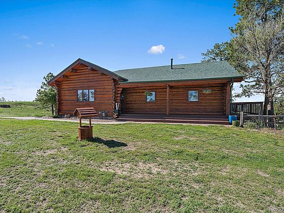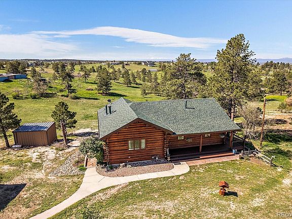 Charming and rustic timber home outfitted on a spacious 5 acres in Southeast Parker! With sweeping mountain views off the rear deck and Tech Center and Downtown views from the wrap-around front porch, this quaint timber home is a must-see! Open space corridors and large privacy trees line parts of the acreage property. Large shop for storage or workspaces on property, plus a detached 2-car garage that provides ample storage space and a loafing shed - perfect for your animals to shelter in. Bring your horses! The spacious wrap-around front porch extends to the rear of the home to take in the perfect mountain and city views. Not only is the exterior of the home lined with gorgeous timber, but the interior of the home is also decorated with the enticing timber work throughout. Greeted by heightened vaulted ceilings that are adorned with timber and log work to accent the home upon entry, homeowners get the rustic and mountain feel of the home. Manicured with a traditional fireplace feature, the great room is an expansive, open-concept room that allows for homeowners to comfortable live in. Wooden framed windows set the scenery, bringing the outdoors in and keeping the cozy feel. Connected to the great room is the spacious remodeled kitchen that allows for homeowners to have enough space for meal prep and entertainment. Lined with ample cabinetry and countertops, a sink that backs to a window to take in the views, and an eat-in space big enough for a small family, this kitchen has it all. The spacious, main floor primary features an attached 3/4 bathroom. The main floor guest bedroom shares a hallway 3/4 bathroom. The walkout basement features a large recreation room adorned with the woodwork from the main level and a fireplace feature. Completing the basement is a laundry room in the 3/4 bathroom and a spacious 3rd bedroom. You won't want to miss this opportunity!!