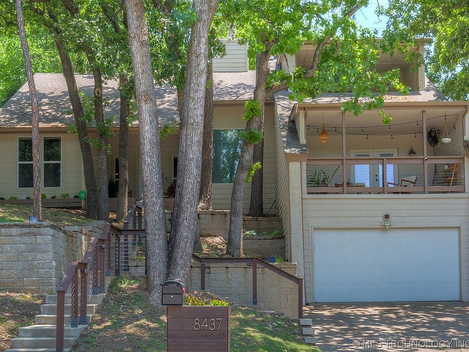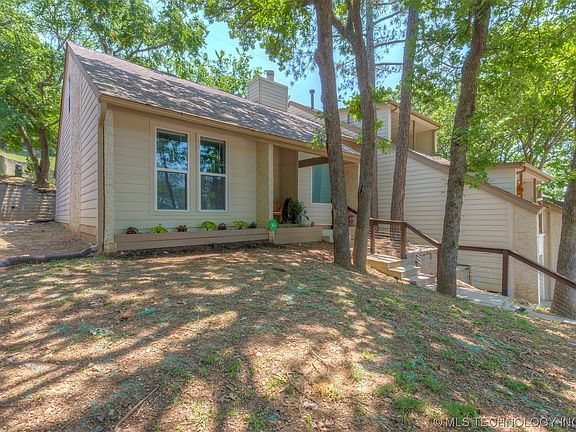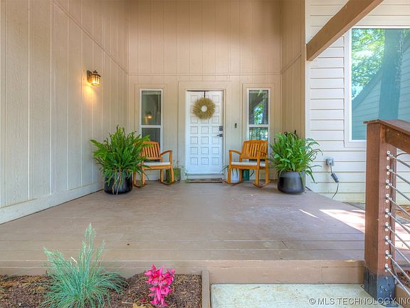 DECKED OUT CONTEMPORARY HOME with MULTIPLE HANGOUT AREAS and an OPEN LAYOUT. This home features a spacious covered front porch, large living room with vaulted ceilings and lots of natural light. The Kitchen has exotic granite countertops, refinished high quality self closing cabinets and an island with pullouts & cabinetry on both sides. Going down a few steps you'll land in another living area that can be a lounge, office, play room, craft rom-you name it! From here, you can step out onto the covered deck and take time to breath, relax and enjoy the Oklahoma sunsets. Upstairs you'll find 2 more bedrooms, lost space PLUS another deck-this deck has beautiful winter views as well as sunsets! This ENTIRE 2nd floor can be a master retreat! The home is perched on an apx 1/3 acre lot with an extended patio overlooking a serene backyard with fruit trees, a chicken coop and striking retaining walls. This is prime location and sought after neighborhood surrounded by major amenities. The Forest Creek pool is an 11 minute walk! Just 2.9 miles away is River Spirit event center & Casino which features entertainment year round and is a staycation destination!