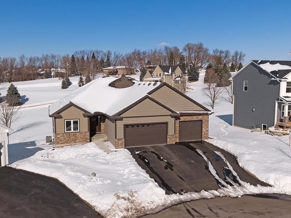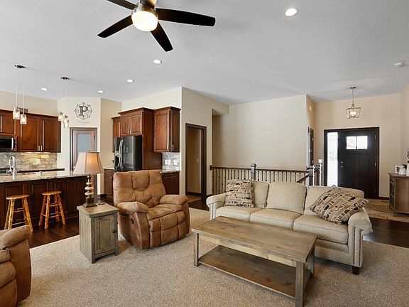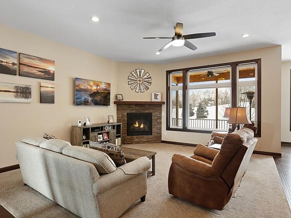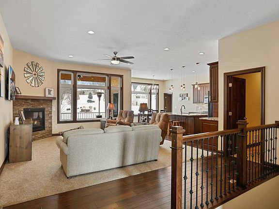 Come see this almost new sprawling 5-bedroom, 3-bathroom executive rambler located on one of the BEST lots in Lakeville (private lot situated at the end of a cul-de-sac). Features Include: 3 over sized bedrooms on the main lvl, gourmet style kitchen w/ custom cabinets, upgraded counter-tops, prof series appliances, hardwood floors on the main lvl w/ a gas fireplace & custom surround, a lavish owner's suite w/ crown molding, a custom walk-in shower, & custom window treatments throughout. A must see screened-in porch w/ tongue and groove ceiling walks out to an entertainment sized deck (Trex decking / maintenance-free). Lower lvl includes: 2 additional bedrooms, an over sized family room featuring a wet-bar, secondary fireplace, & storage galore. Exterior: LP smart-side on the front of the house, gutters, prof landscaping, and much more! You will not find another lot like this in Lakeville.