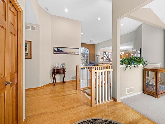 Captivating rambler situated on a premium Cul-De-Sac lot overlooking nature, pond and woods. Tastefully updated and includes an open design concept with oversized windows to capture light and take advantage of the magnificent back yard views. Enjoy main floor living with a vaulted primary bedroom, primary bath with heated tile floors/jetted tub/separate shower; formal & informal dining & a living RM w/gas Fplc. Updates include: kitchen with new appliances/tile backsplash/hard surface countertops/under cab lights (2022), updated main flr laundry (washer & dryer 2019), maintenance free Trex deck (2014) W/ electric awning, new steel siding and windows (2017), furnace, A/C & roof (2013). Walkout lower level features great entertaining spaces with billiard area (pool table & accessories included), wet bar, a large family room w/gas fplc, two additional bedrooms, updated 3/4 bath (2021), a large patio & great storage/workshop area. Adjacent to park and miles of scenic walking trails.