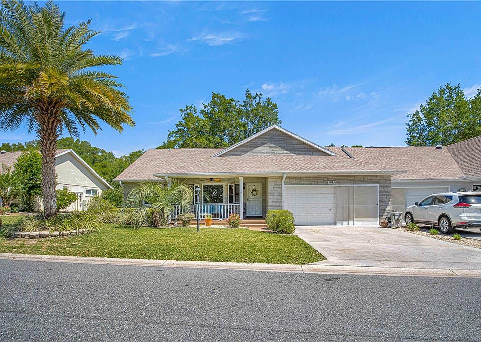 Spacious AUGUSTA END UNIT model villa awaits you in the highly sought after 55+ gated golf community of On Top of the World in SW Ocala. This updated home features: Roof 2022, HVAC 2018, and Window World Windows 2013 with transferable Lifetime Warranty. Enjoy the palm trees from your large covered front porch, which has a ceiling fan to keep you cool and gravel rock flooring. As you enter the home, you’ll notice the high vaulted ceiling in the spacious Great Room. To the left there is a large flex room with lots of custom shelving. The oversized master bedroom suite is located in the back left for privacy. The master bedroom includes TWO closets (one walk in & the other a full wall), an en-suite bathroom with walk-in show and comfort height toilet, and is light and bright with lots of windows. The split floorplan has the 2nd bedroom with large walk-in closet located in the back right of the home. The guest/hall bathroom with a tub and comfort height toilet is in the hall, and another closet for storage. The open concept kitchen – dining room features granite counter tops with tile backsplash, extra cabinets for serving and storage along the side wall, a large prep island with space for bar stools, plus an oversized pantry. The adjoining dining room is perfect for entertaining and leads you into the open Florida room, which is under heat and air. From there step outside onto the covered patio, perfect for a BBQ and to relax in your very private backyard, which is flanked by tall hedges. Large 2-car garage features washer and dryer, utility sink and pull-down attic stairs. The monthly HOA fee includes basic cable, roof repair, exterior painting every seven years, exterior maintenance and insurance, landscaping, trash, 24/7 guarded gates and all the amenities that OTOW has to offer; three pools (two outside & one inside), archery, billiards, softball, 175+ resident clubs, two state of the art fitness centers, pickleball courts, remote control flying field and race cars, and much, much more! ** Ramp in garage DOES NOT convey.