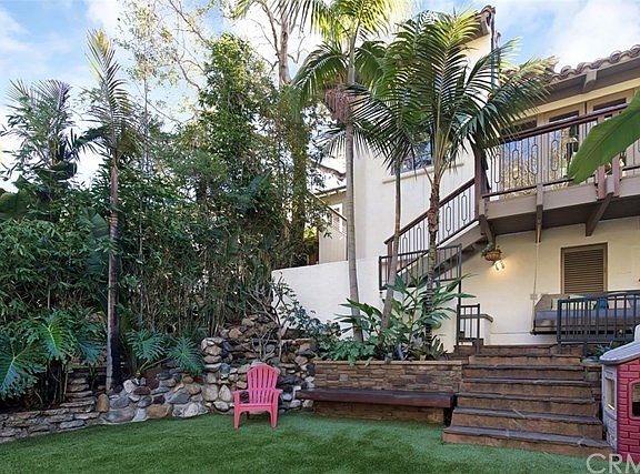 Costa Rica meets Laguna Beach! This tropical paradise includes a 4 bedroom residence composed of 3 levels. An extensive remodel of the home was completed in 2016.The main entry level, which is street level, is comprised of the main living space. The kitchen, with top of the line appliances, is at the heart of the home with its central location to all the main living spaces of the residence. This open floor plan has the family room open to the kitchen. Just down the hall from the family room are 2 main floor bedrooms, direct access to the garage and a ¾ bath. A Palladian window in the formal dining room reveals the expansive back yard. The master suite resides on the entire upper floor and an abundance of windows fills the room with natural light and the beauty of Laguna. On the lower level, the living room is not only spacious but also grand with vaulted wood beam ceilings which can be found throughout the home. Also on this this level is a bar, a bath and a bedroom. The deck leads to the highlight of this home, the back yard. Very few properties in Laguna offer yards this large. A natural babbling brook runs through it with a foot bridge that leads to an artist's studio.