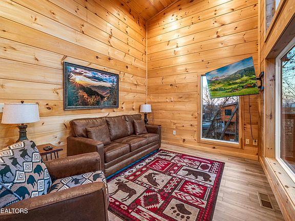Income Producing short term rental located in Gatlinburg's finest, Chalet Village! 3 miles from Downtown and less than 6 miles to Pigeon Forge! Built in 2022 and sitting on a half acre of land! An impressive 90% Occupancy rate with great guest reviews! Master bedroom, full bathroom, kitchen and living space all on the main level. Enjoy the views from the upper back deck and potential to create a better view by removing some trees on the property! Lower level includes an open game room/theater room and additional sleeping! Twin bunk bed and large sectional with a sleeper sofa. Multiple games create the perfect environment for kids and families to enjoy together! Hard cover hot tub on the Spacious lower deck! Chalet Village amenities are available with a one time payment, affordable fee. 3 different Clubhouses include swimming pools, a tennis court, and a gym all within the community! This cabin stays booked, contact an agent for showing availability.