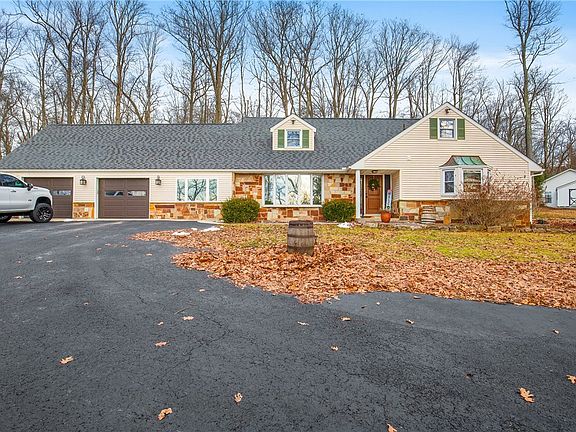 Beautifully updated home with amazing views just outside of town. So much privacy. Lots of character with tasteful wood floors and trim. Spacious cherry kitchen, nice aplliances, open view window to backyard and plenty of counter space with sit up peninsula. Breakfast room and formal dining with stone fireplace that also leads to screened in porch and patio. Large living room and 1st floor family room. Main floor master en-suite with walk in wet room with tub and shower, two unique vanities, custom made closet. 2nd floor has 4 more bedrooms, hall full bath, additional storage space . Laundry room on 1st floor. Great outdoor space for entertaining and watch the wildlife. Fully finished Rec room, 6th Br, 1/2B LR, Dr, great for a in law space. Add a kitchenette. Home warranty included.