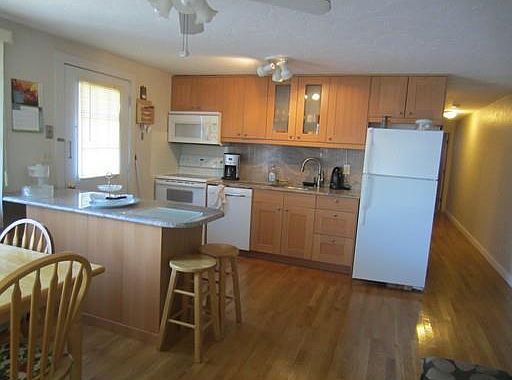 Super nice first floor unit at Seine Pond Condominium features many updates including hardwood flooring in the living area, updated maple kitchen, ceiling fixtures and fans, newer paint, updated appliances and more. There's 2 nice bedroom, an updated bath and the complex is both convenient and quiet with frontage on and a trail down to salt water Swan (Seine)Pond. Separate laundry room. Less than a mile to the ocean beach too! Probably the best opportunity to enjoy first floor living in a year round 2 bedroom condo in a well managed and cared for complex at this price! Great value and immediate occupancy available. Furniture negotiable as well