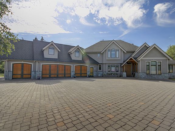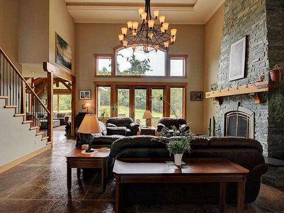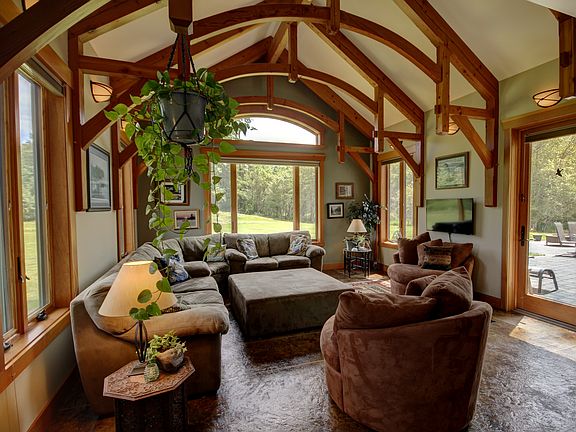 Stunning home w/outstanding craftsmanship situated on very private & peaceful nearly 10 acres! Located in a small gated community, this magnificent home is constructed w/reclaimed fir timber frame, mortise & tenon joinery, oversized windows to let in plenty of natural light. Dazzling great rm has grand stone fireplace, gorgeous family rm has arched timber beams. Elegant kitchen w/ granite counters & stainless appliances, nook looks out to pond w/dock! All bedrms have bathrms & walk in closets!