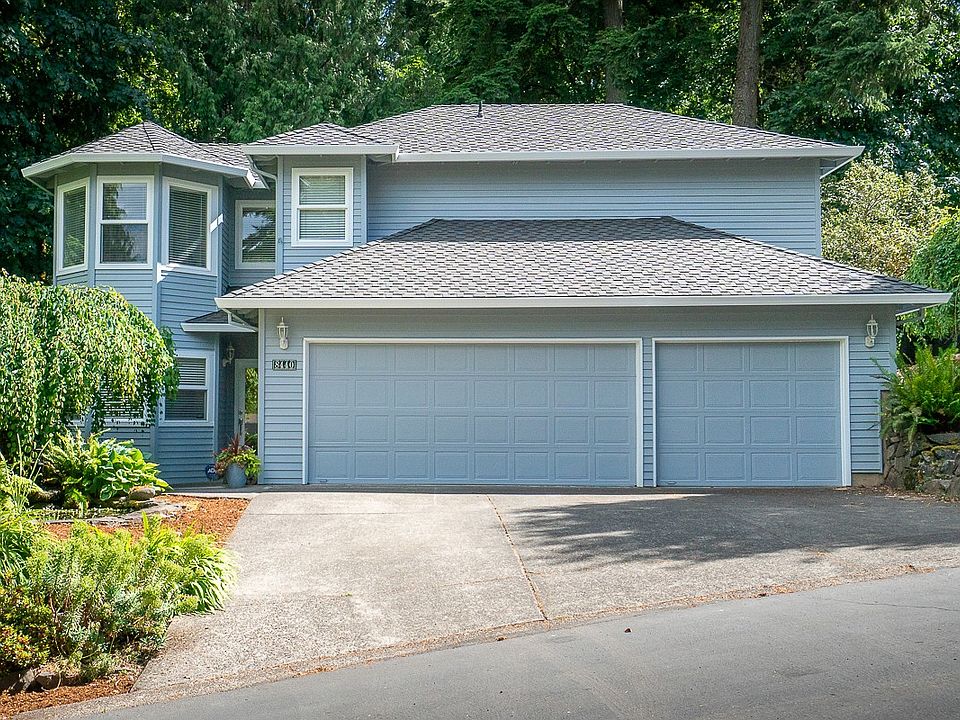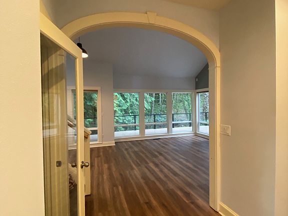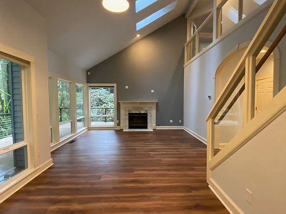 Live in your own private nature sanctuary, and still be close to shopping, restaurants, walking trails and parks. This elegant home features new flooring, newly remodeled kitchen, all new appliances and updated guest bath. This gorgeous home has floor to ceiling windows that let in abundant light. It has a stunning view of a greenspace with native trees and a 4-season creek. The fabulous, remodeled kitchen has new cabinets, new stainless-steel appliances, corner sink with windows, quartz counter tops, a bay window and eating area overlooking the exquisite lily pond with lovely landscaping. The main level living and dining area have expansive ceilings, fabulous views and inviting fireplace with French doors leading to the expansive deck. Enter the upper-level spacious primary suite using an open walkway to enjoy the forest view. The primary suite has a fabulous primary bath, soaking tub, giant walk-in closet, and a private deck overlooking the trees. The upper level also includes a second bedroom, or an office, with a bay window. The main and upper levels have top of the line new vinyl plank flooring. Ceramic tile flooring is throughout the lower level. The lower-level family room with fireplace and additional bedroom and full bath could be perfect for multi-generational living or a spacious guest suite. The washer and dryer on the lower level are new. There is a 3-car garage and handy workshop with cabinets, sink, work bench and access to deck. Renter pays utilities and trash. Maximin 3 pets. Pet deposit to be determined. One year lease. No smoking.