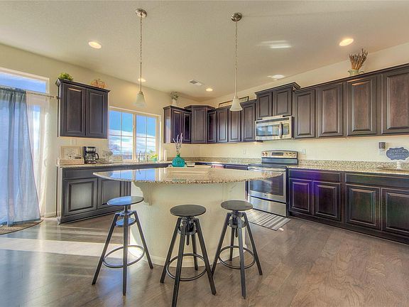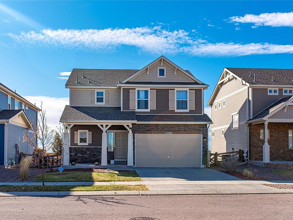 Desirable Banning Lewis Ranch community, built in 2015. This adorable home is clean and well maintained, boasts great interior features & community amenities. Large open floor plan on the main level with lots of natural light to welcome guests. Gas fireplace, pre-wired for surround sound throughout the house and pre-wired for A/C. Upgraded kitchen with a curved seating island, granite, large pantry and stainless steel appliances. Landscaped backyard, walk-out deck facing open space with stunning views of Pikes Peak. Huge master bedroom with a large walk-in closet and walk-in shower. Ample storage closets throughout and storage space in the basement. Unfinished basement provides future opportunity to expand your finished space. Community center with junior Olympic sized pool & fitness center, there are 4 parks with different amenities, water park, soccer and baseball fields, 50 miles of trails, dog park, community concerts and farmers market. A fabulous lifestyle community!