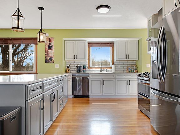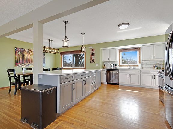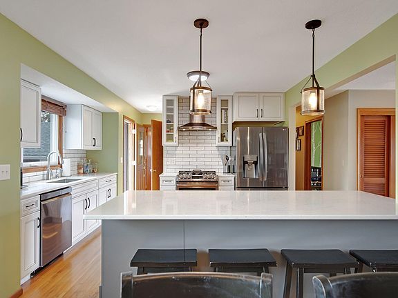 Enjoy the good life all year long with peaceful lakeside views on Meadow Lake. This warm and inviting 3 BD, 2 BA rambler sits on nearly a ½-acre lot and features an oversized 2-stall garage. Inside, you'll find an updated kitchen with high-end stainless-steel appliances, new windows throughout the upper level, and a 2022 modern mini-split system for energy-efficient comfort. With just over 1925 finished sq ft and all three bedrooms on one level, the home offers a functional layout for everyday living. The lower level includes a fun bar area, flexible space for an office, den, or workout room, a cozy gas fireplace, and more. Outside, relax with serene lake views or enjoy paddle boating and kayaking in the warmer months, and create your own ice rink in the winter. Meadow Lake is quiet and non-motorized, ideal for nature lovers. Located just blocks from parks, an elementary school, and Village Golf Course, with easy access to Highways 169, 94 and 100. You won’t want to miss this one!