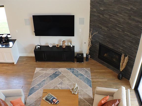 Corner fireplaceOpen floor planHome officeHigh ceilingsWall of windowsFamily roomThree large windows