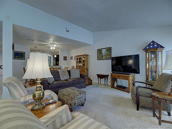 One-level condo in a private gated community. Jenks Schools! Two swimming pools, clubhouses, basketball courts, & tennis courts. 3 bed, 2 bath, attached two car garage. Walk-in closets in every bedroom. The living room has a gas log fireplace. Ample eating space in the dining room. The kitchen has plenty of cabinet storage with 2 ovens, and 2 microwaves, granite countertops. Butler's pantry in the laundry room. Plenty of outdoor entertainment with two patios. You'll have wonderful neighbors! Seller is offering a 5,000 dollar flooring allowance.