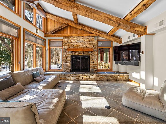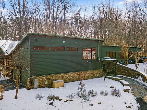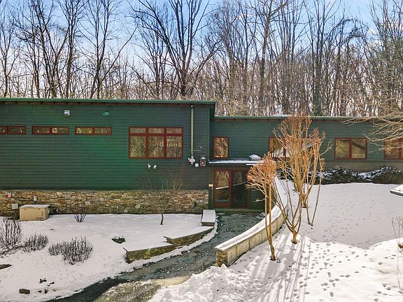 Stunning contemporary home is now available in the sought-after Mariner's Cove. This gorgeous Mid Century Modern property features 4 large bedrooms, 2 full bathrooms, and 1 half bathroom nestled in a wooded 7+ acre lot. Walking through the front door, you will be struck with the amount of natural sunlight and open space. The cozy living room with a stone propane fireplace welcomes you and leads into the airy dining room. Vaulted ceilings and exposed reclaimed wood beams add to the light atmosphere. The updated gourmet kitchen aims to please with ample counter and cabinet space, stainless appliances, soapstone counters and dual kitchen islands, one of which doubles as a breakfast bar. You'll find ample storage space off the kitchen, with laundry space and a butler's pantry. You'll also find additional open loft space. Embrace luxury in the primary suite, with a large bedroom, spacious bath with dual sinks, sunken soaker tub, and separate shower. There is also a large walk-in closet with a surprise bonus room with a loft that can be utilized as an office, a workout room or additional storage. Two additional bedrooms round out the bedroom wing. A fourth bedroom off the kitchen can be used as study, office, studio or anything else you can think. The attached 2 car garage with powder room, heat, and loft space as well as the detached garage offer ample space to retreat, store your toys and have fun. Relax outdoors on a screened-in porch or overlooking the pond. This home features owned solar panels, geothermal heating and cooling anda tankless water heater. The stunning lot features amazing scenery and a one mile hiking path. Easy access to shopping, dining and commuter routes.