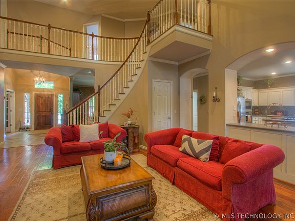 TRUE 5 bedroom home in the heart of South Tulsa. Large lot with mature trees. Side-entry garage. Soaring ceilings in entryway with impressive open staircase & catwalk. 18ft ceilings in living room. Office and bonus rm w/bath down. Bonus rm c/b 6th bedrm. Spacious kitchen with island and abundance of countertop space, cabinets and cupboards. Large master with ensuite that has jetted tub and floor to ceiling walk-in tiled shower. 4 addl bedrms & 2 bathrms up, plus gamerm. Neighborhood walking path & pond.